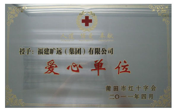 2011年04月      福建曠遠(集團)有限公司,應邀參加在莆田市政府召開的莆田市紅十字會第五屆理事會第五次會議,會上集團被莆田市紅十字會授予“人道 博愛 奉獻”“愛心單位”的榮譽稱號。