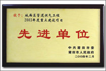 • 2004年02月      被中共莆田市委、莆田市人民政府授予“城廂區管道燃氣工程2003年度重點建設項目先進單位”。