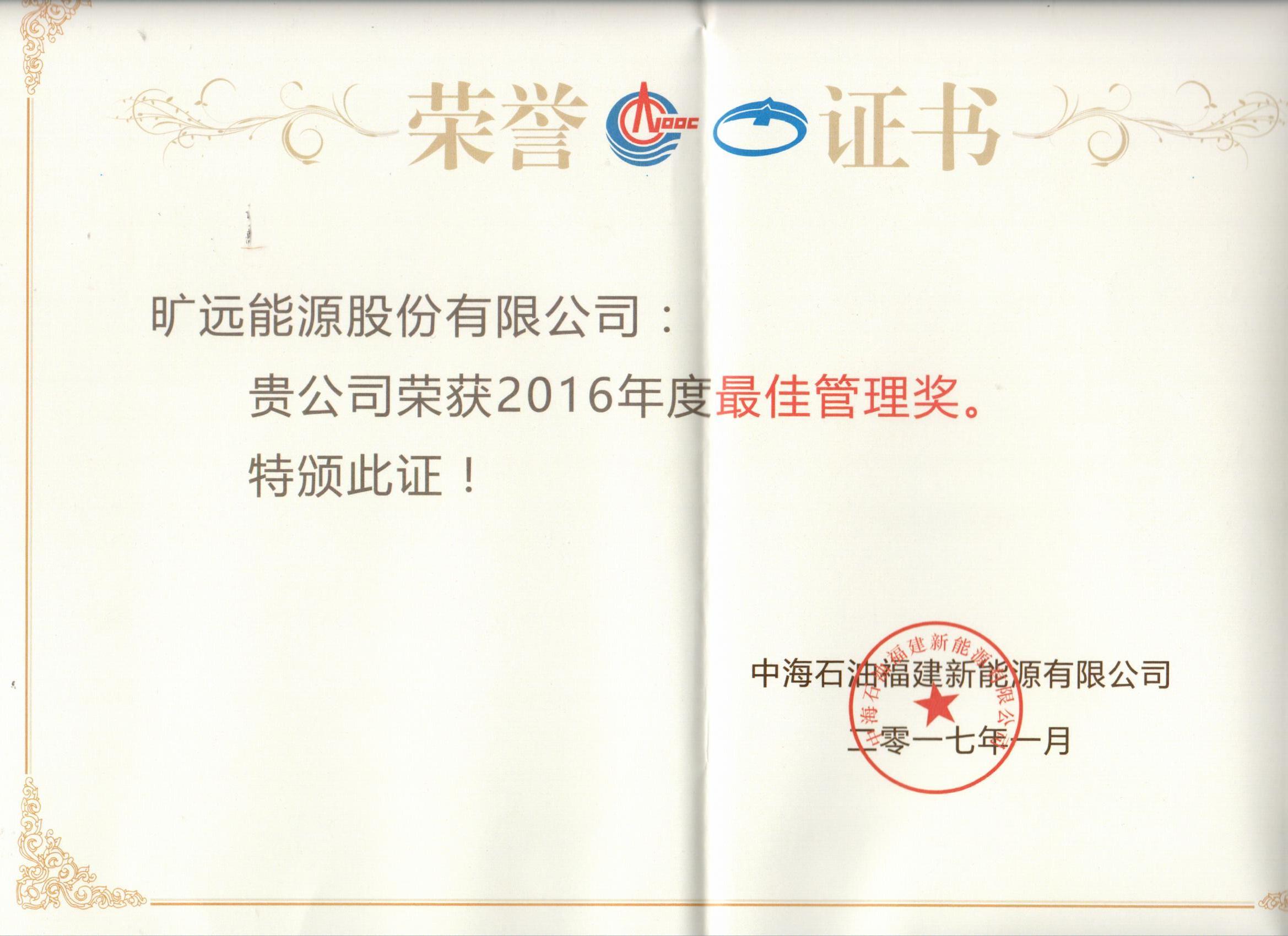 • 榮獲中海石油福建新能源有限公司頒發的“2016年度最佳管理獎”榮譽證書。