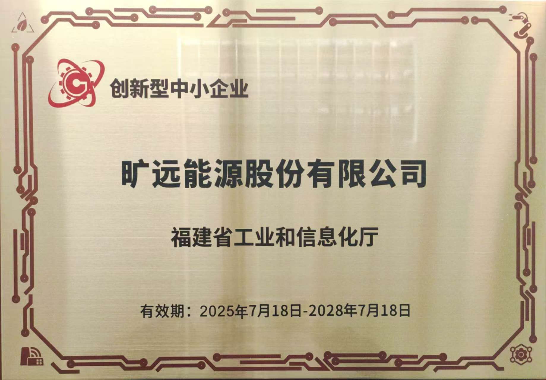2026年3月 曠遠(yuǎn)能源股份有限公司榮獲福建省工業(yè)和信息化廳創(chuàng)新型中小企業(yè)(有效期:2025年7月18日-2028年7月18日)