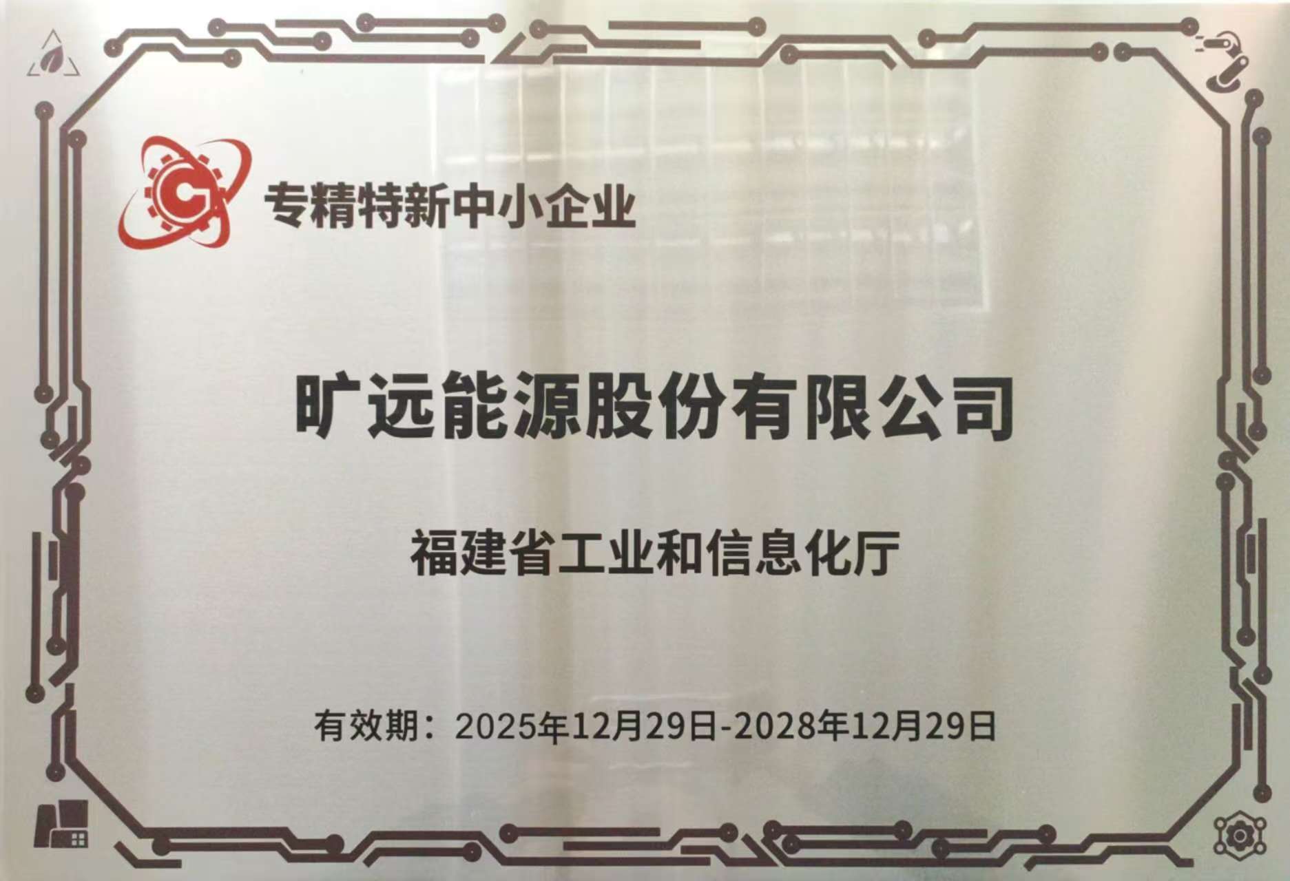 2026年3月 曠遠(yuǎn)能源股份有限公司榮獲福建省工業(yè)和信息化廳專精特新中小企業(yè)(有效期:2025年12月29日-2028年12月29日)