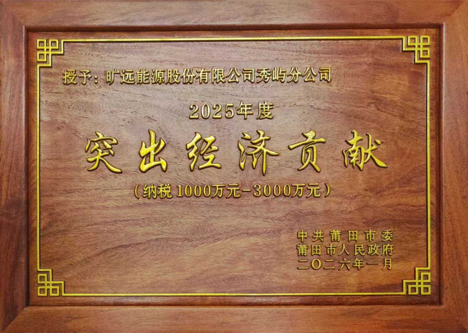 2026年1月 曠遠(yuǎn)能源股份有限公司秀嶼分公司榮獲“2025年度突出經(jīng)濟(jì)貢獻(xiàn)(納稅1000萬元-3000萬元)”榮譽(yù)稱號(hào)