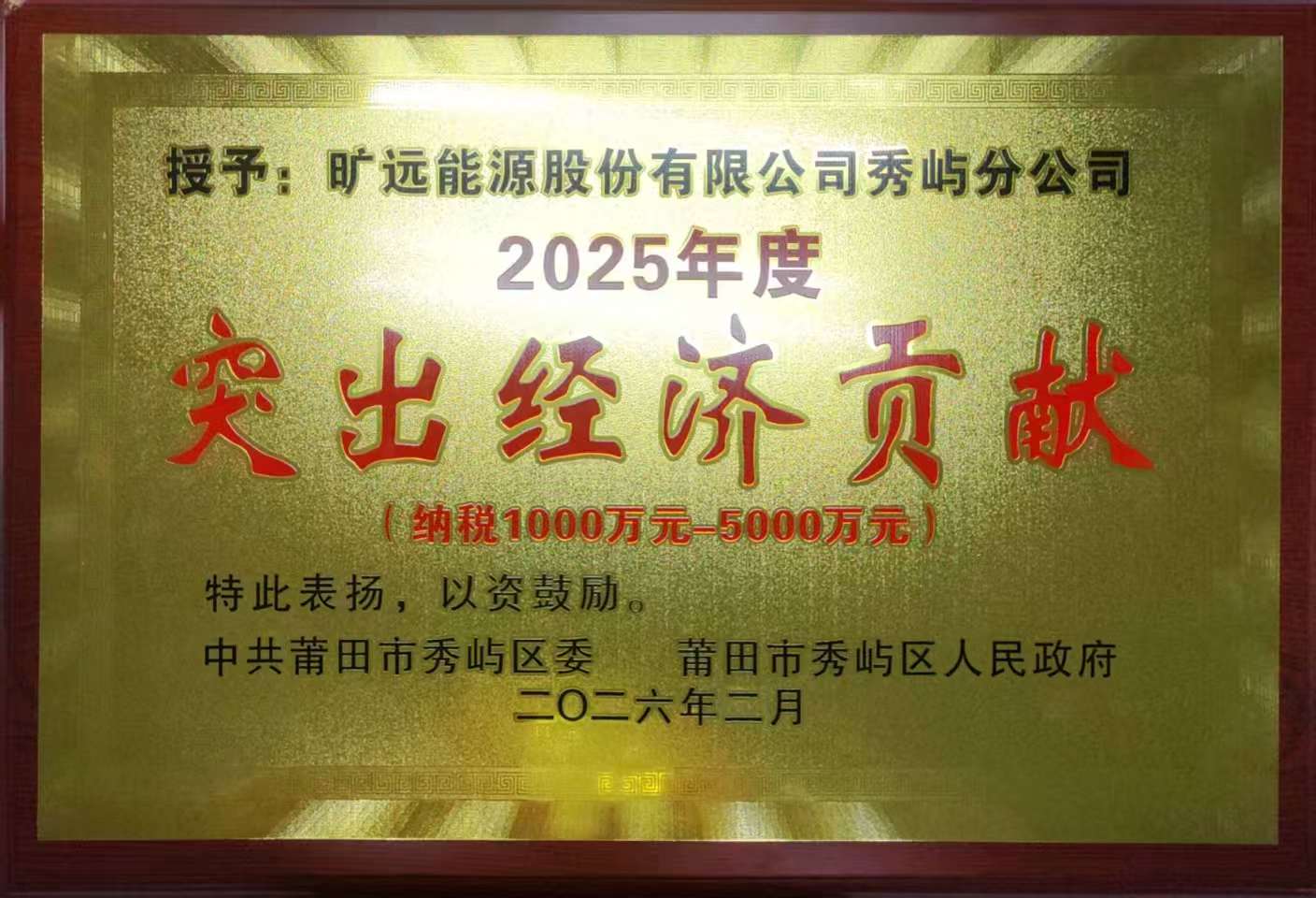 2026年2月 曠遠(yuǎn)能源股份有限公司秀嶼分公司榮獲“2025年度突出經(jīng)濟(jì)貢獻(xiàn)(納稅1000萬元-5000萬元)”榮譽(yù)稱號(hào)