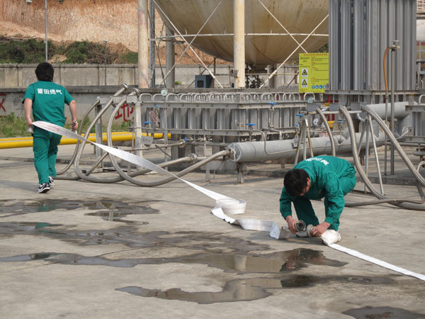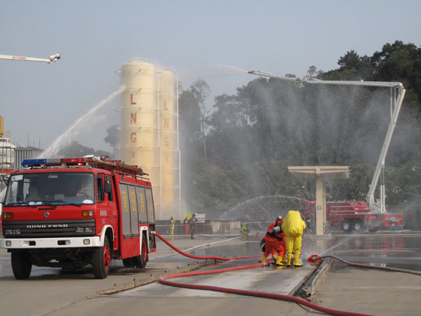 15:30分,隨著生產(chǎn)部報(bào)警聲響起,LNG灌區(qū)發(fā)生泄漏,現(xiàn)場(chǎng)指揮接警后立即按響報(bào)警器,指揮相關(guān)小組啟動(dòng)消防水泵,對(duì)灌區(qū)進(jìn)行緊急噴淋,隔離相鄰儲(chǔ)罐,并組織員工按預(yù)定區(qū)域到達(dá)避難位置。市消防派出2輛高噴消防車、6輛水罐消防車到達(dá)起火現(xiàn)場(chǎng),火情偵檢組隨即展開偵檢,先用泄露儀對(duì)現(xiàn)場(chǎng)進(jìn)行濃度檢測(cè),并用隔離帶劃出相應(yīng)的警戒線,保安配合警戒組疏散區(qū)域內(nèi)無關(guān)人員及在場(chǎng)使用中的車輛熄火,同時(shí)關(guān)閉大門,禁止除消防車、搶險(xiǎn)車外的一切車輛出入。在得知了著火位置和泄漏程度后,中隊(duì)指揮員立即下令,展開滅火行動(dòng)。消防隊(duì)員穿上消防戰(zhàn)斗服、佩戴防毒面具和呼吸器、攜帶銅質(zhì)工具和滅火器材迅速趕往事故儲(chǔ)罐,關(guān)閉儲(chǔ)罐根部所有閥門。而其余消防車按照預(yù)期指定位置,全方位對(duì)LNG灌體進(jìn)行火災(zāi)撲救。